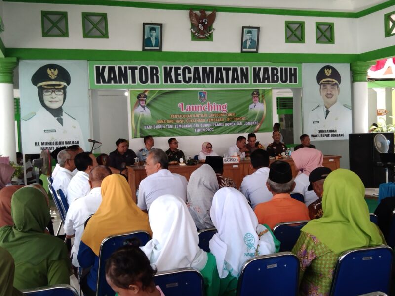 Kabuh, Jombang – Bupati Jombang Hj Mundjidah Wahab meresmikan penyaluran Bantuan Langsung Tunai Dana Bagi Hasil Cukai Hasil Tembakau (BLT DBHCHT) senilai Rp6,7 miliar kepada petani dan buruh tembakau di Kabupaten Jombang tahun 2023. Penyaluran perdana dilakukan di Kantor Kecamatan Kabuh, Rabu (13/9/2023).