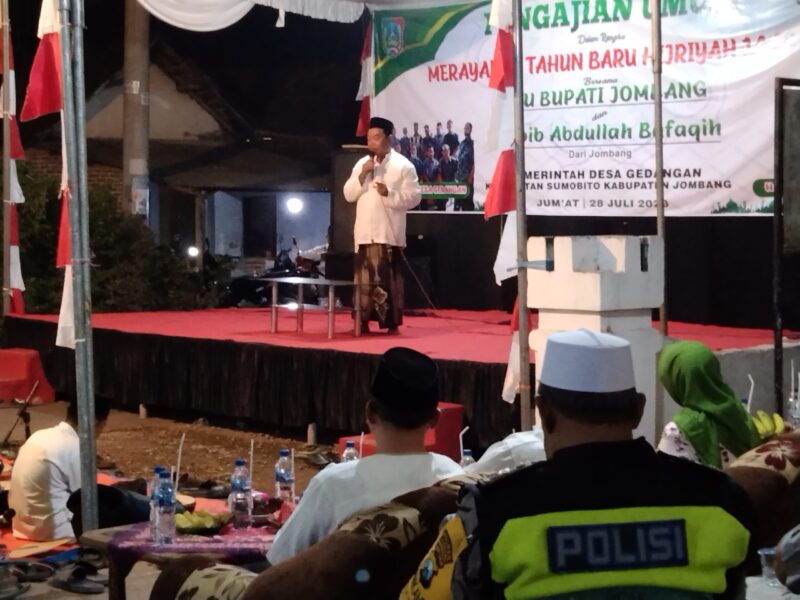 Informasipro- Desa Gedangan, Kecamatan Sumobito – Pengajian umum di desa Gedangan menjadi pusat perhatian masyarakat pada Jum’at, 28 Juli 2023. Acara ini diselenggarakan dalam rangka merayakan tahun baru hijriah 1445 H dan dihadiri oleh banyak tokoh penting, di antaranya Bupati Jombang Hj. Mundjidah Wahab, Habib Abdullah Bafaqih, Kepala Desa Gedangan H. Edi Santoso SH., dan Kepala Desa se-Kecamatan Sumobito.