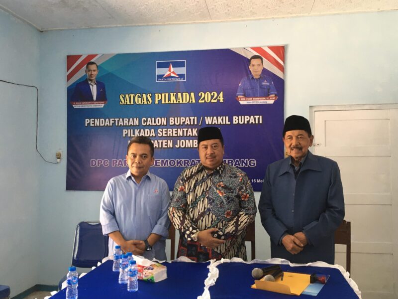Kantor DPC Partai Demokrat Jombang pada Senin (6/5/2024) siang dipenuhi oleh pemandangan yang tak biasa. Puluhan kepala desa dan sejumlah orang berseragam biru memadati lokasi tersebut, mengantar Ketua Asosiasi Kepala Desa (AKD) Jombang, Warsubi, untuk mendaftarkan diri sebagai calon bupati Jombang di Pilkada 2024.