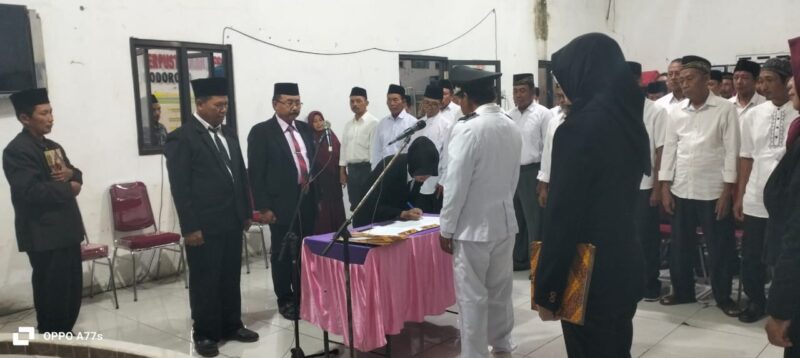 Sekretaris Desa (Sekdes) Podoroto, Umar Fauzi, S.Pd.i, membacakan keputusan kepala desa mengenai pemberhentian dan pengangkatan kembali tiga perangkat desa. Ahmad Ismail, Nurcholis, MA., S.Pd.i, dan Anggi Amanda Septiandari, resmi dilantik kembali dalam jabatan baru untuk periode 2025-2029.